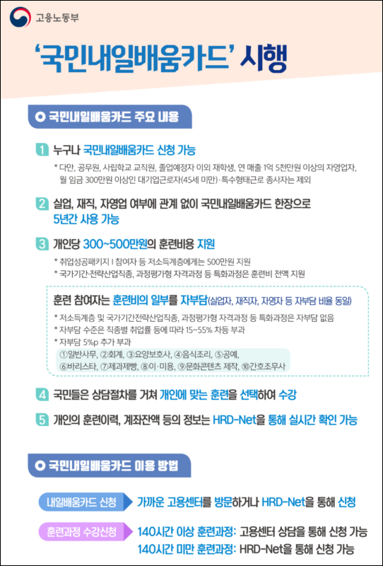 실업, 재직, 자영업 여부에 관계없이 국민내일배움카드를 발급하고