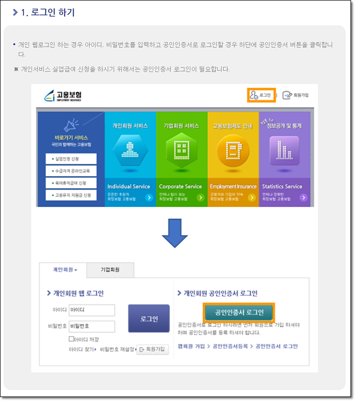 개인서비스 실업급여 신청을 위해 공인인증서 로그인을 합니다.
