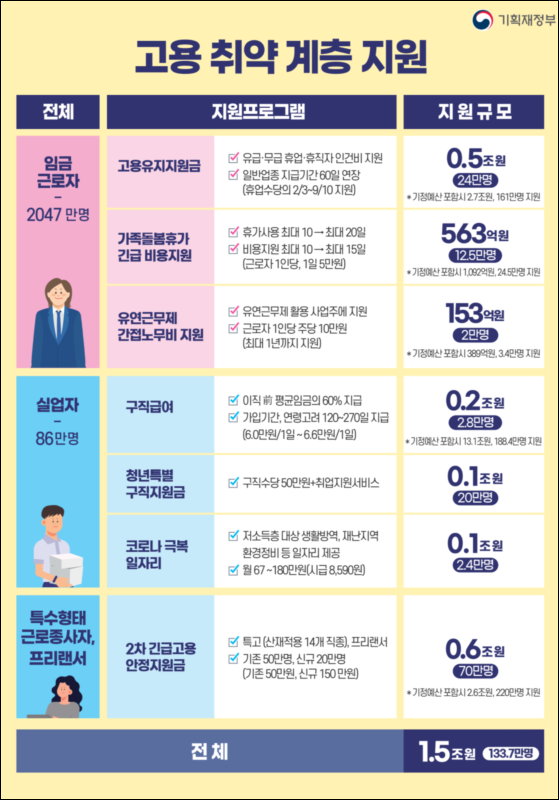 또한 집합금지 단속보조,재난지역 환경정비등에 긴급 일자리 2만4000개를 만들어 공급하기도 한다는 소식입니다.