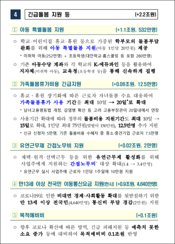 또한 직장을 잃거나 가게나 점포를 닫게된 사정이 여려운 가구에게도 최대 100만원을 주고, 아동 특별 돌봄대상도