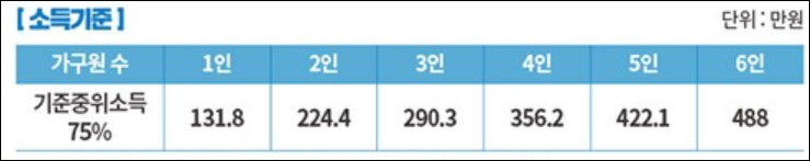 소득기준의 경우 중위소득 75%는 1인의 경우 131.8만원 2인 224.4만원, 3인 290.3만원, 4인 356.2만원 5인 422.1만원