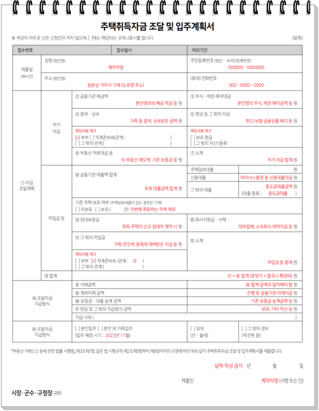 주택취득자금 조달 및 입주계획서 예시, 작성방법
