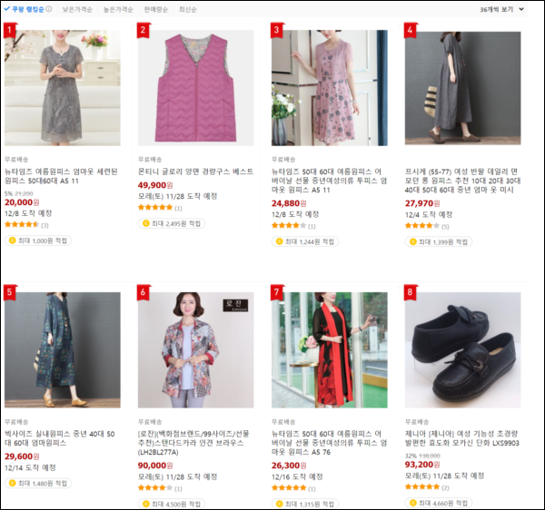다음은 N사 쇼핑몰이다. 역시 엄마옷, 할머니 옷으로 대변되는 옷들이 많고 화려함을 자랑한다.