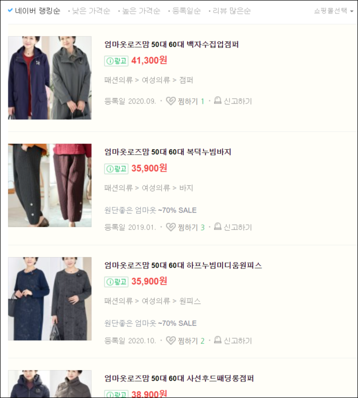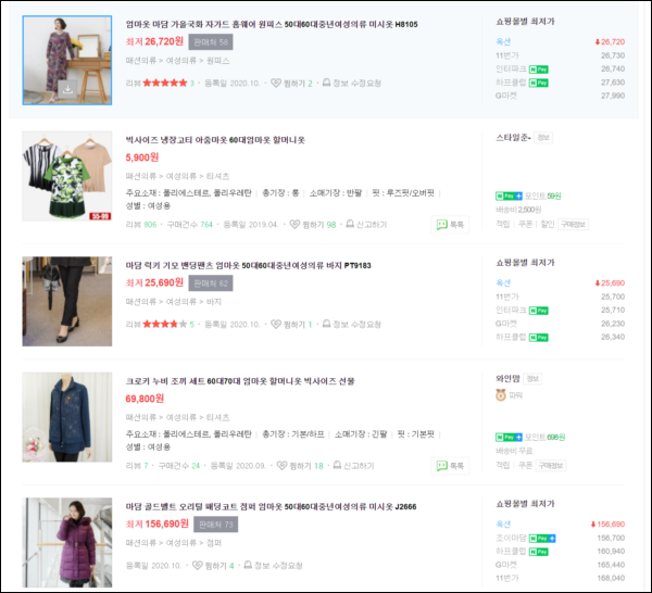 다음은 N사 쇼핑몰이다. 역시 엄마옷, 할머니 옷으로 대변되는 옷들이 많고 화려함을 자랑한다.