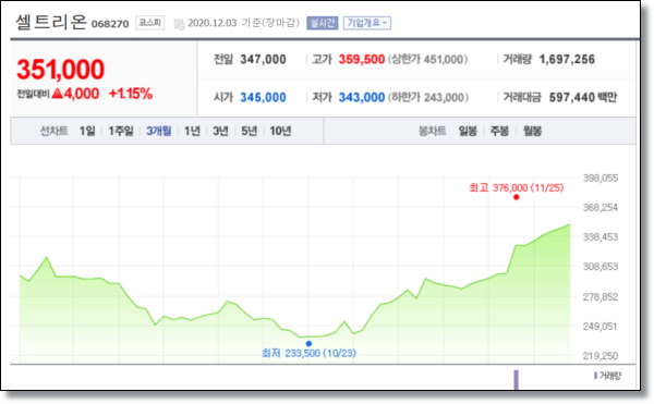 셀트리온 주가는 오늘 12월 3일 현재 351,000원입니다. 저는 현재 12%의 수익을 얻었습니다.
