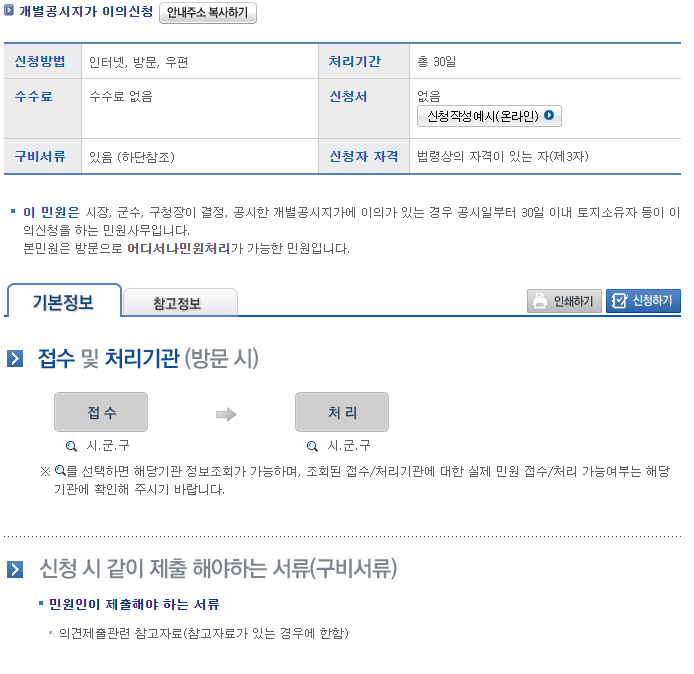 개별공시지가 이의신청은 시장, 군수, 구청장이 결정, 공시한 개별공시지가에 이의가 있는 경우 공시일부터 30일 이내 토지소유자 등이 이의신청을 하는 민원사무로서 본민원은 방문으로 어디서나민원처리가 가능한 민원입니다.
