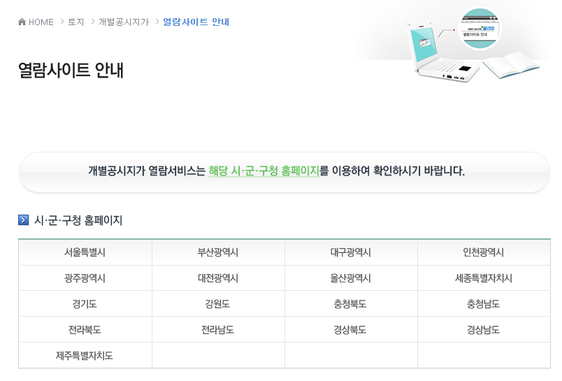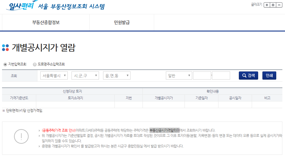 이 곳에서 주소와 지번을 통해 개별공시지가 열람이 가능합니다.