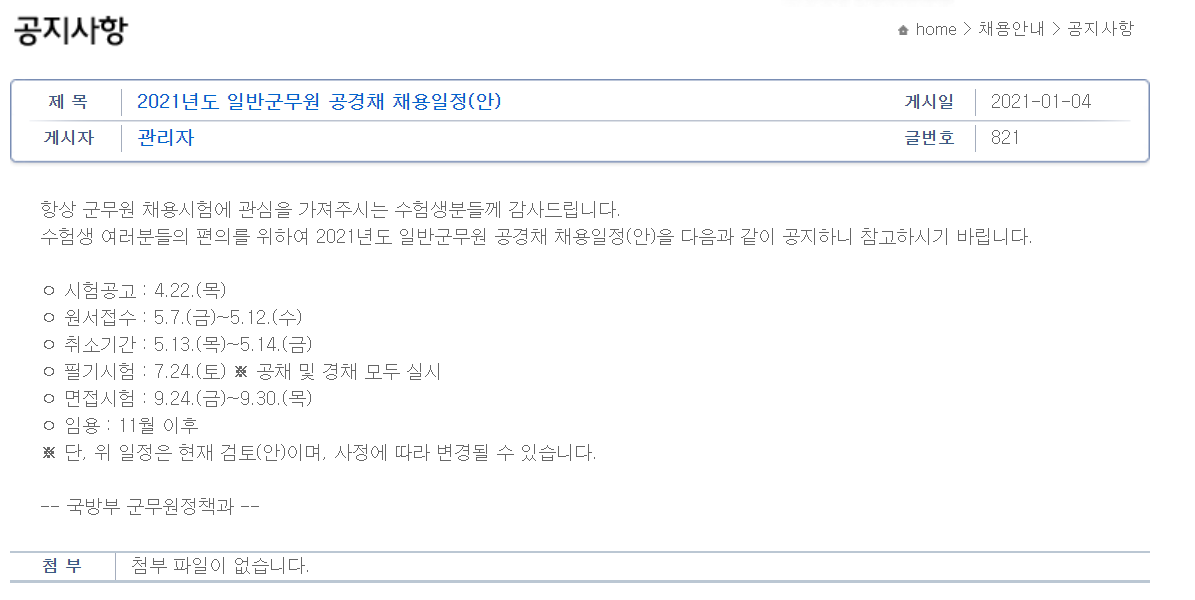 국방부는 채용관리 페이지를 통해 2021년 일반 군무원 공경채 채용일정을 발표했습니다.
