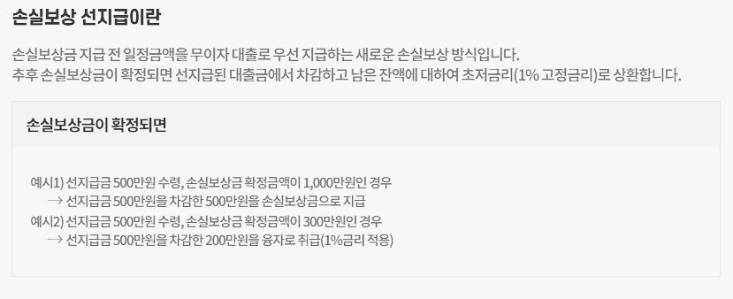 손실보상지급전 일정금액을 무이자 대출로 우선 지급하는 새로운 방식의 손실보상입니다. 추후에 손실보상급이 확정되면 선지급된 대출금에서 차감하고 남은 잔액에 대하여 초저금리(1% 고정금리)로 상환됩니다.